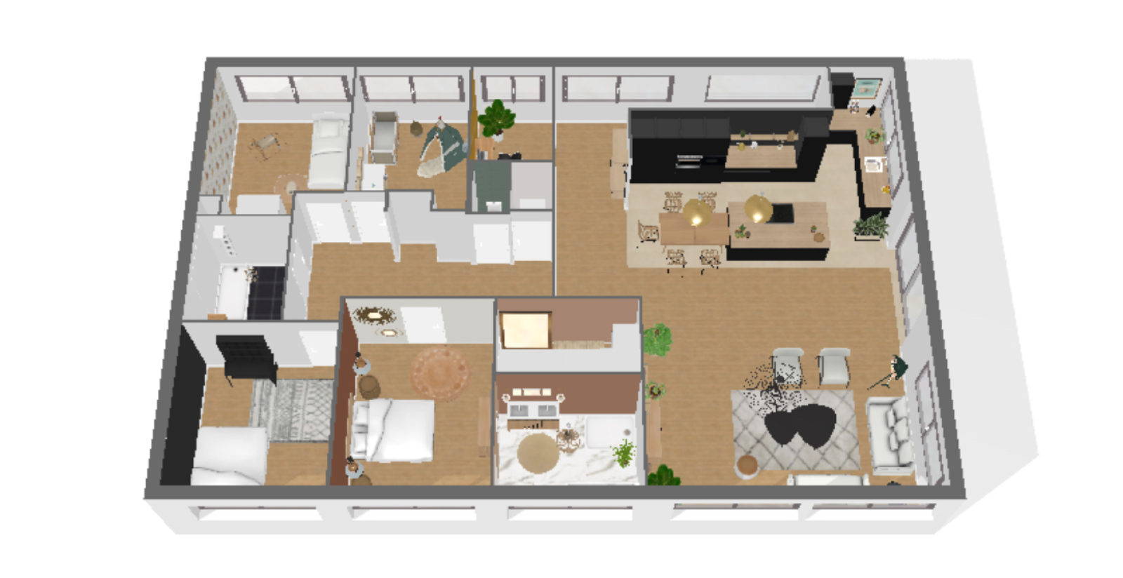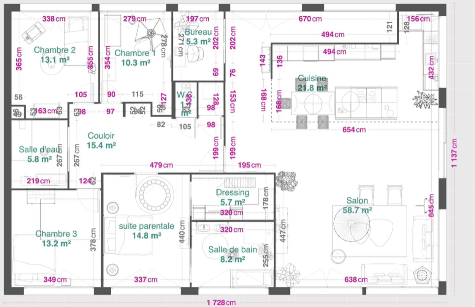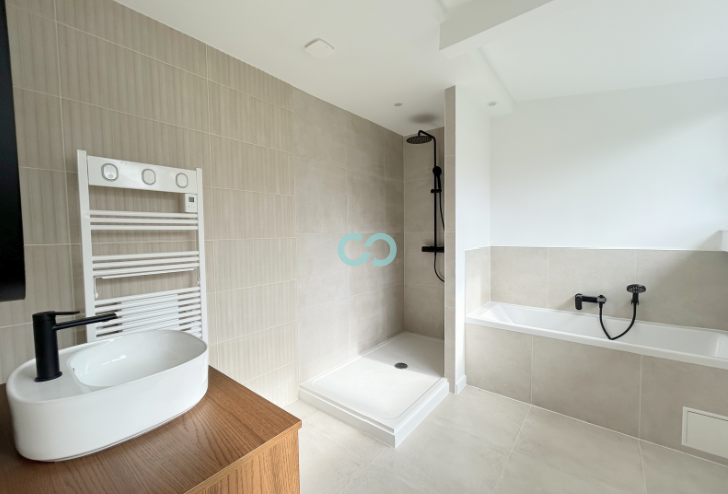 Il dispose d’une entrée indépendante menant à un vaste séjour de près de 59 m², prolongé par une cuisine ouverte de 22 m², aménagée et entièrement équipée. L’espace de vie est complété par un bureau, trois chambres avec chacune leur salle de douche, ainsi qu’une suite parentale comprenant une salle de bains et un dressing. Un balcon agréable permet de profiter d’un extérieur en toute tranquillité, et une place de parking peut être acquise en supplément pour plus de confort.